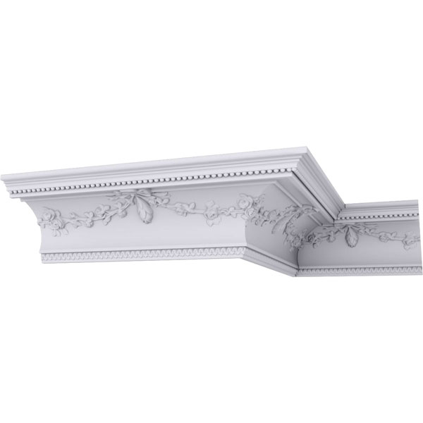 Endurathane Floral Swag Crown Moulding, 6 3/4"H x 6 7/8"P x 9 5/8"F x 94 1/2"L, (19 1/4" Repeat), Factory Primed