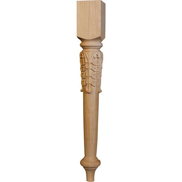 Our Acanthus Leaf Carved Dining Table Leg combines the beauty of three elements into one impressive leg. The profile of this leg features a simple taper that descends from below a 5 1/2" square top. The top is separated from the taper by a single, simple turned ring that is set off by a few smaller turnings below. The tapered portion of the leg finishes with an inverted bell foot that is the very essence of understated elegance. And to complete the elegant presentation: the upper portion of the taper is embellished with an expertly carved acanthus leaf design culminating in a tasteful combination of simplicity and finesse. This 29" tall, 3 1/2" wide table leg will give your dining table or desk an elegant uplift. It is available in several wood types and will be sanded to 150 grit allowing for easy finishing. Make it your own by adding your choice of paint or wood stain. You can further complete your space with our full selection of acanthus leaf products located in our Vineyard Collection. Add complementary corbels, furniture feet and moulding to create a stunning theme that can be incorporated throughout every room in your home.