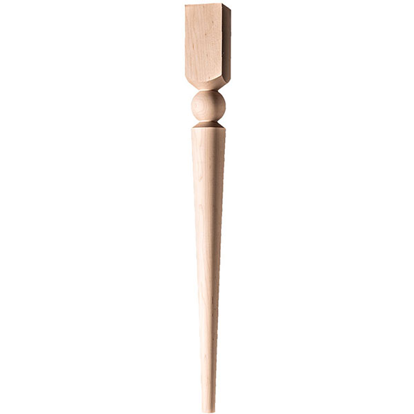 The Brighton Dining Table Leg is a simple design that will make a big statement in your space. It is composed of three geometric sections - the 5" square top block adds to the stability and functionality of the design. This block is followed by a sphere and then a round tapered cone that continues to the base of the leg. This artful piece will add unique dimension to your furniture. It has a mid-century modern or traditional presence, but is sleek enough to fit into a contemporary home, as well. At 29" tall and 2 3/4" wide, this wooden table leg will stylishly adorn any dining table or desk creation. It is available in several wood species and can be easily customized to fit your decor. We also offer this profile in an 18" height which can work for coffee tables or benches. Use the Brighton Coffee Table Leg (Part #2323) alongside this dining table leg to create a stunning complementary set!